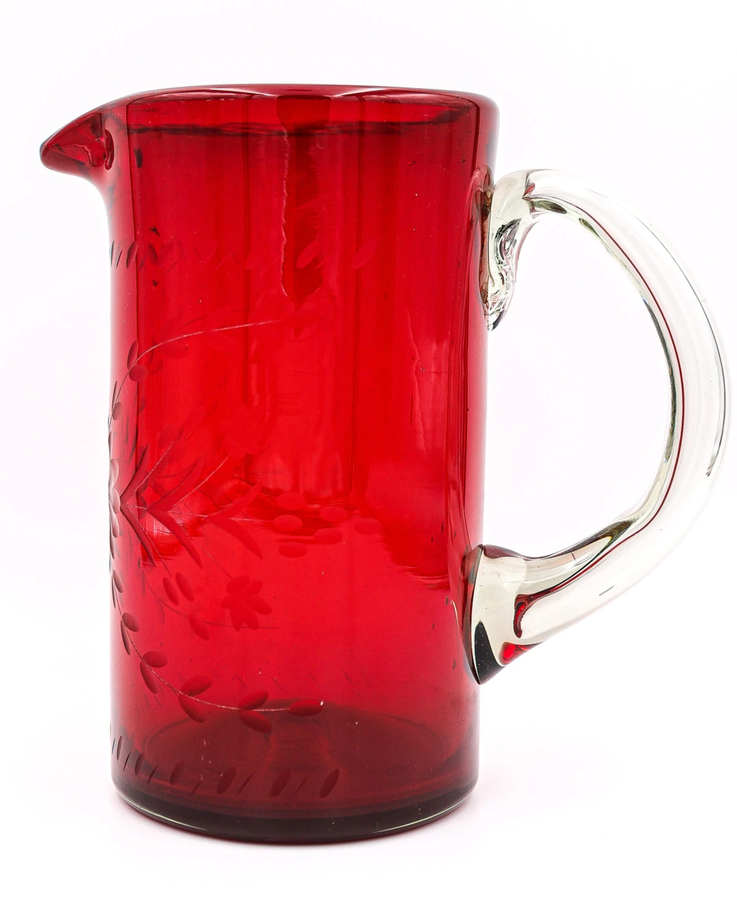 Mix up a batch of fresh lemonade in this Red Condessa Pitcher by Rose Ann Hall. Hand-blown and hand-etched flowers and leaves add enchanting texture and dimension to the recycled glass.