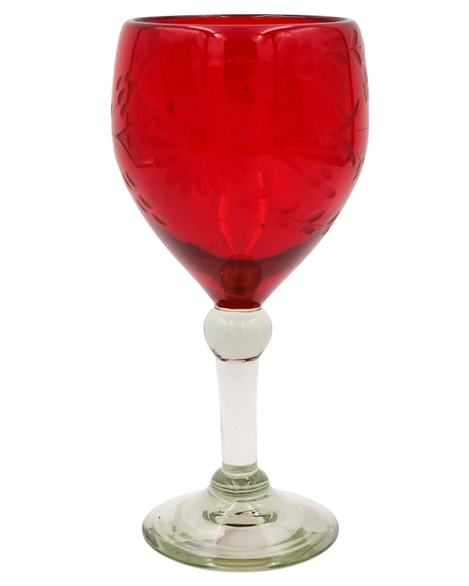 Rose Ann Hall Design’s Condessa Wine Glass in Red is hand-blown by talented craftsmen in Mexico from recycled glass. Each glass is etched by skilled maestros who engrave the design directly onto the glass using only a grinding stone and an experienced eye.