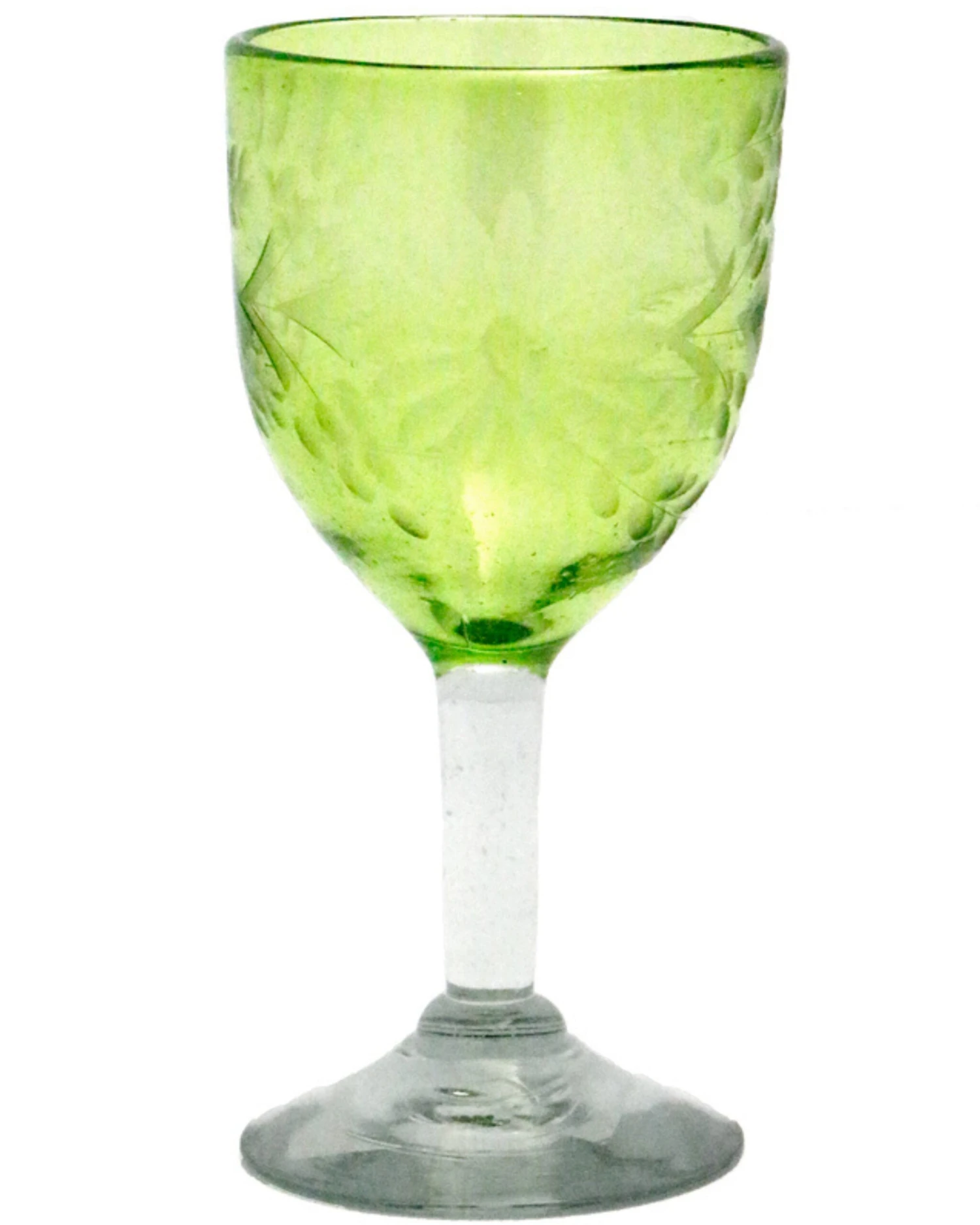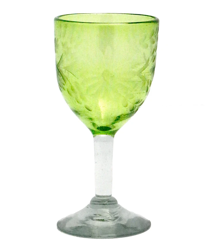 Rose Ann Hall Design’s Condessa Wine Glass in Verde is hand-blown by talented craftsmen in Mexico from recycled glass. Each glass is etched by skilled maestros who engrave the design directly onto the glass using only a grinding stone and an experienced eye.