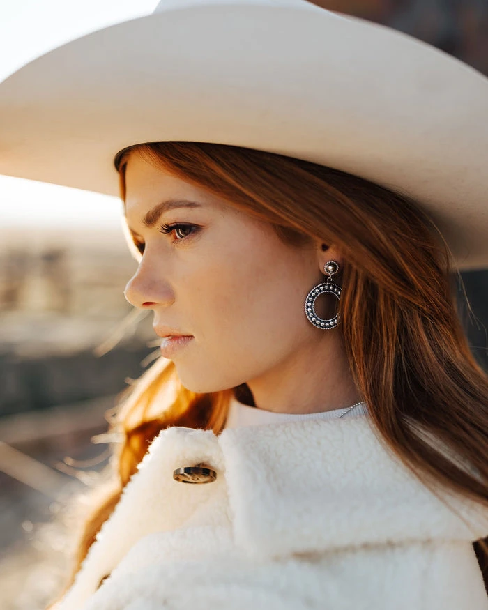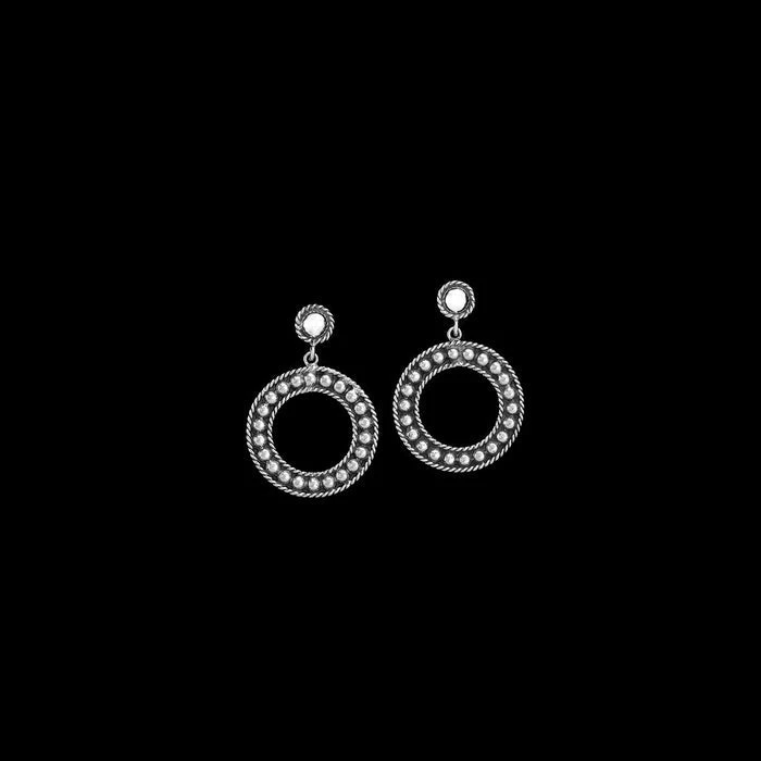Featuring one of Vogt’s iconic designs, The Makin’ The Rounds Blair Hoops feature a 1″ sterling disc with an open center lined with hand-set, 3 mm sterling beads and hand-twisted sterling rope edges. The disc dangles from a smooth 5 mm sterling bead framed with a rope edge, concealing a hypoallergenic stainless steel post.