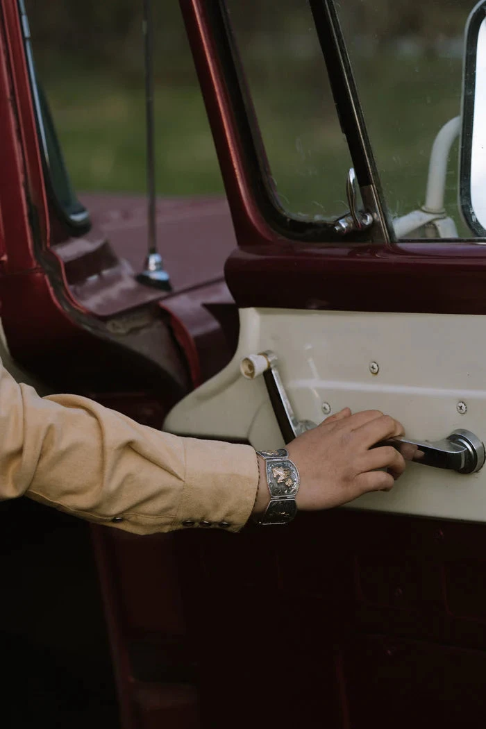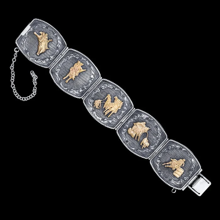 The ultimate homage to the sport of rodeo, this square-concho linked bracelet features six rodeo-ready figures in gold against an engraved, stippled antiqued background. Finished with our signature rope edge. Conchos feature a bareback rider, a bull rider, a team roper, a calf roper, and a barrel racer.